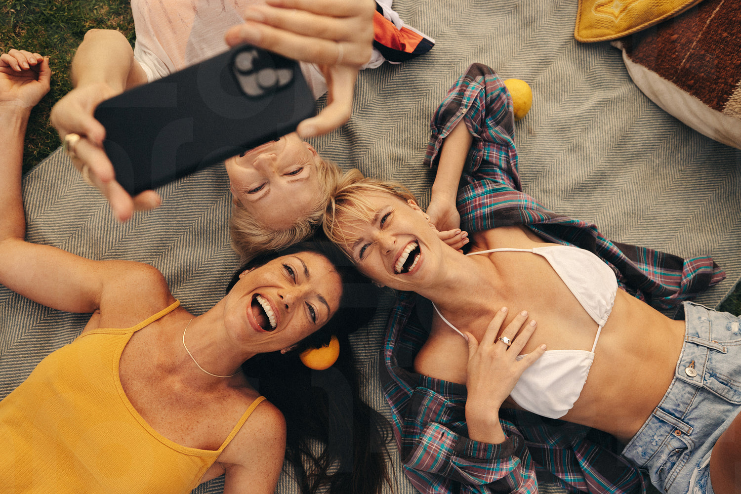 Group of women in their 30s are hanging out outdoors, socializing and having fun. Three friends taking a playful selfie with their smartphones, capturing their happy smiles and memories of friendship. This photo has intentional use of 35mm film grain.