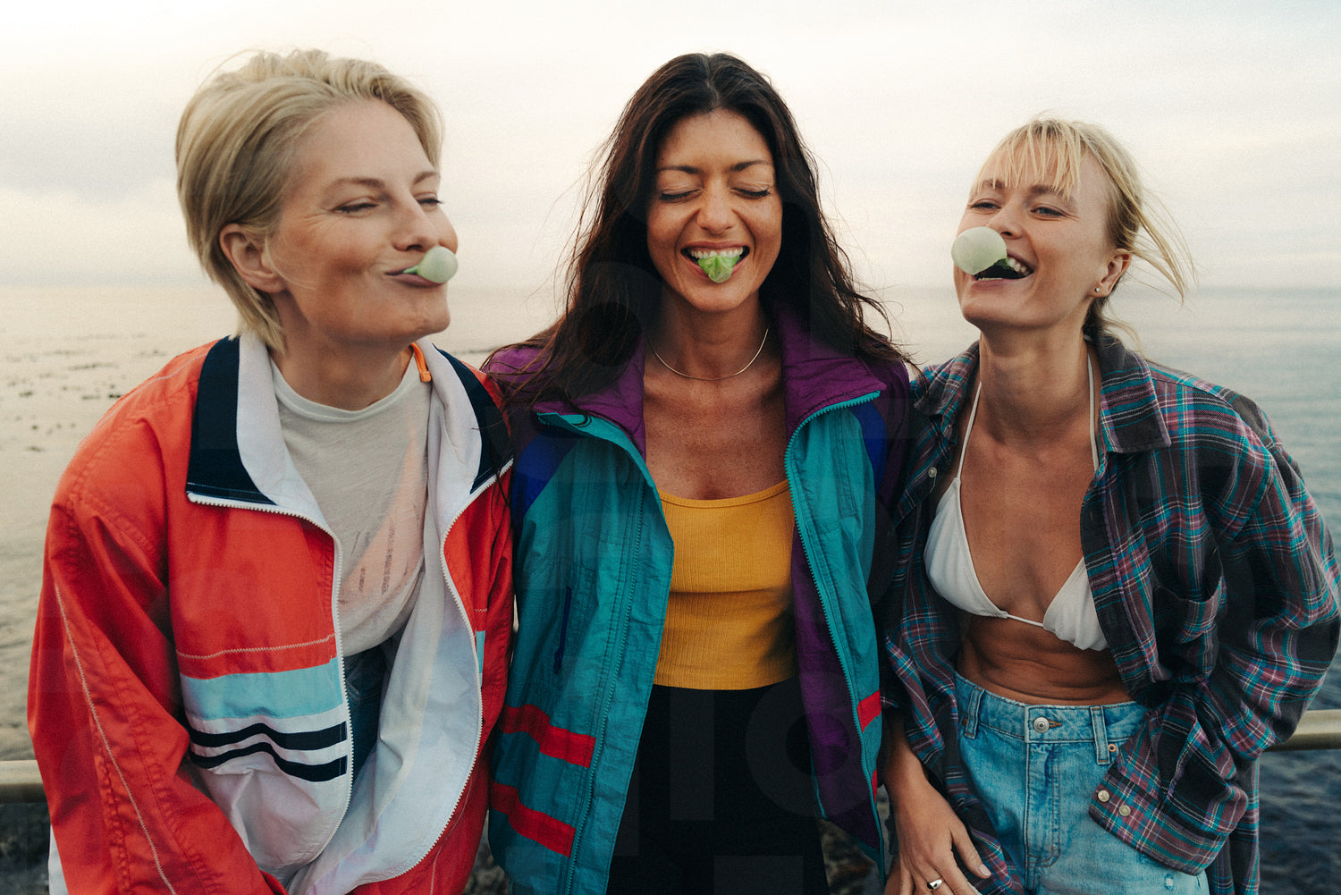 Group of female best friends having a fun day together by the ocean. Three happy women blowing bubbles and creating a playful atmosphere while enjoying the seaside breeze. This photo has intentional use of 35mm film grain.