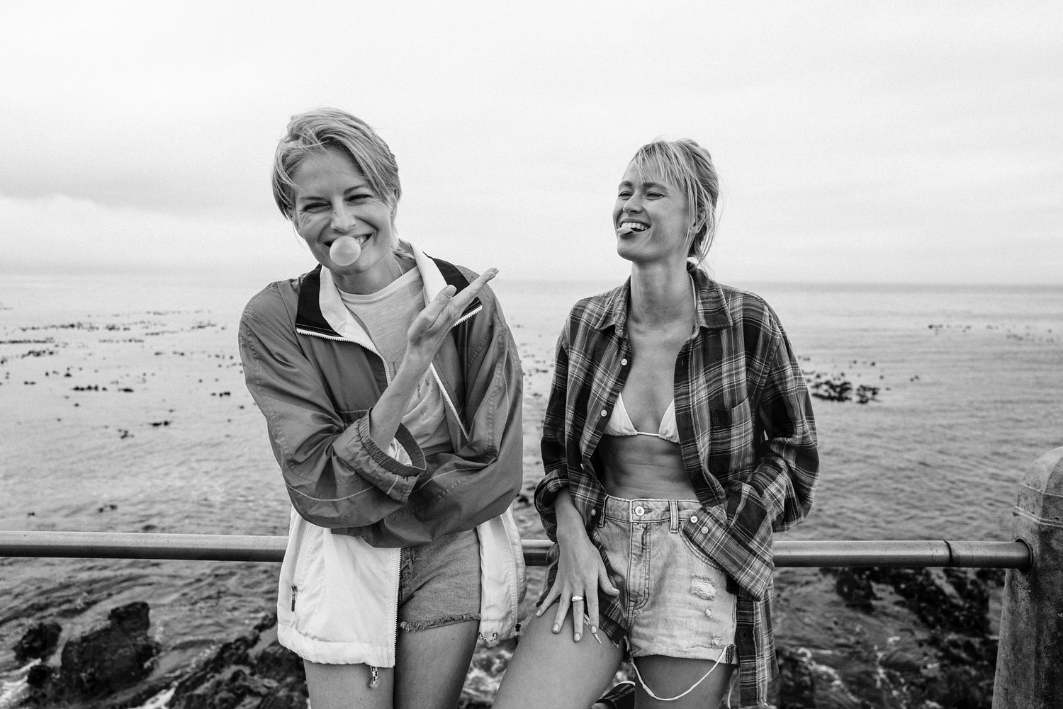 Cheerful female friends spend a carefree day by the sea promenade. They are happy and having fun, blowing bubbles with gum, enjoying the outdoors, and creating joyful moments together. This photo has intentional use of 35mm film grain.