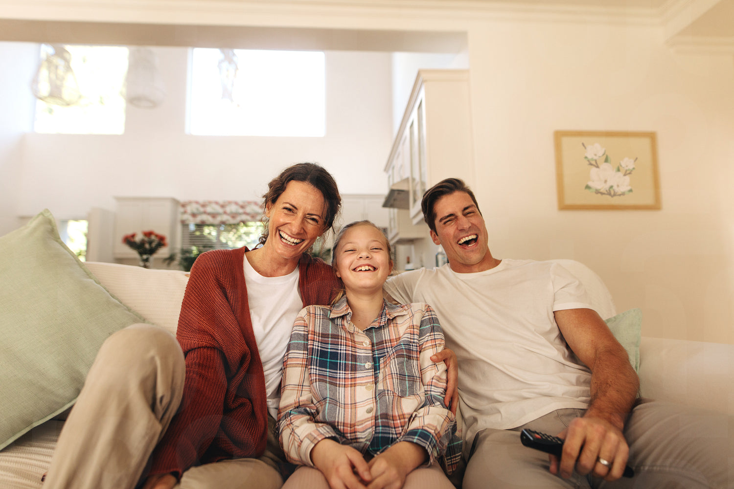 Smiling family sitting on sofa enjoying watching television at home. Family of three relaxing at home watching tv.