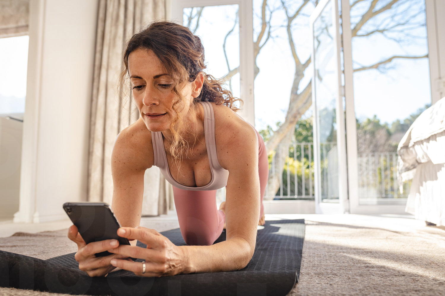 Woman performing yoga on mat using online session on mobile phone. Female working out at home in corona virus pandemic.