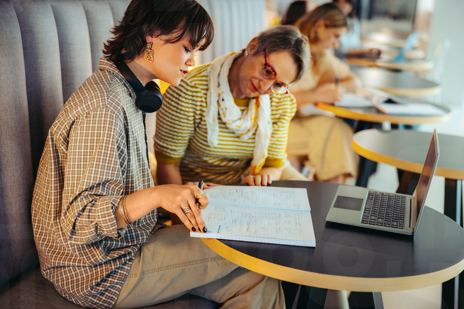 A teacher and student collaborate in a contemporary cafe setting, using notes and a laptop for an interactive teaching session.