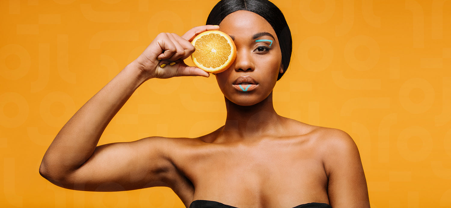 Portrait of young woman with artistic make-up holding an orange against her eye. Female model looking at camera over yellow background.