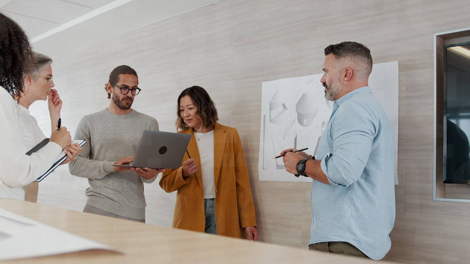 Diverse design professionals working together on a project in a mechanical engineering office. Group of creative business people discussing a 3D drawing on a laptop as they brainstorm in a meeting.