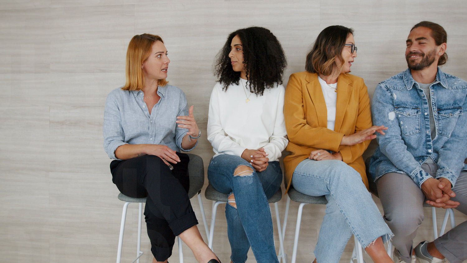 Diverse group of business professionals dressed in business casual sit in a row against a wall, engaged in a panel discussion, that showcases their expertise. Business people exchanging ideas in an office.