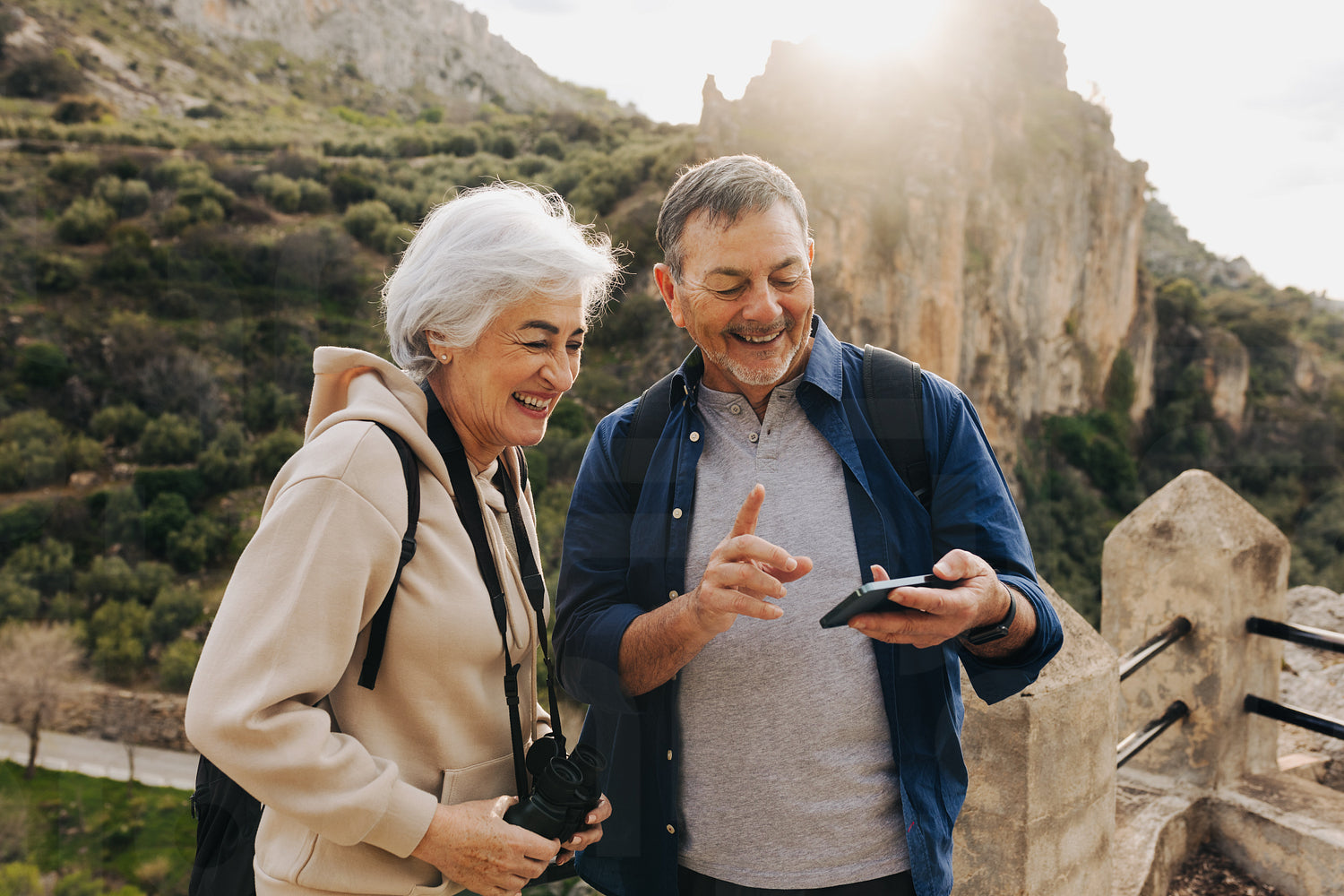 Carefree senior couple having a video call while standing on a hilltop. Happy elderly couple enjoying a recreational hike outdoors. Adventurous couple having a good time together after retirement.
