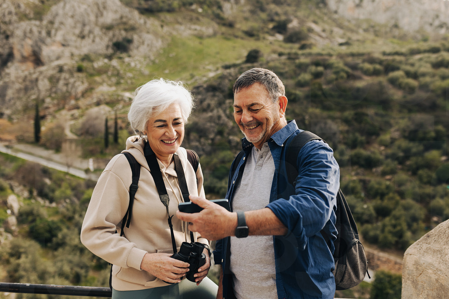 Happy senior couple having a video call while hiking