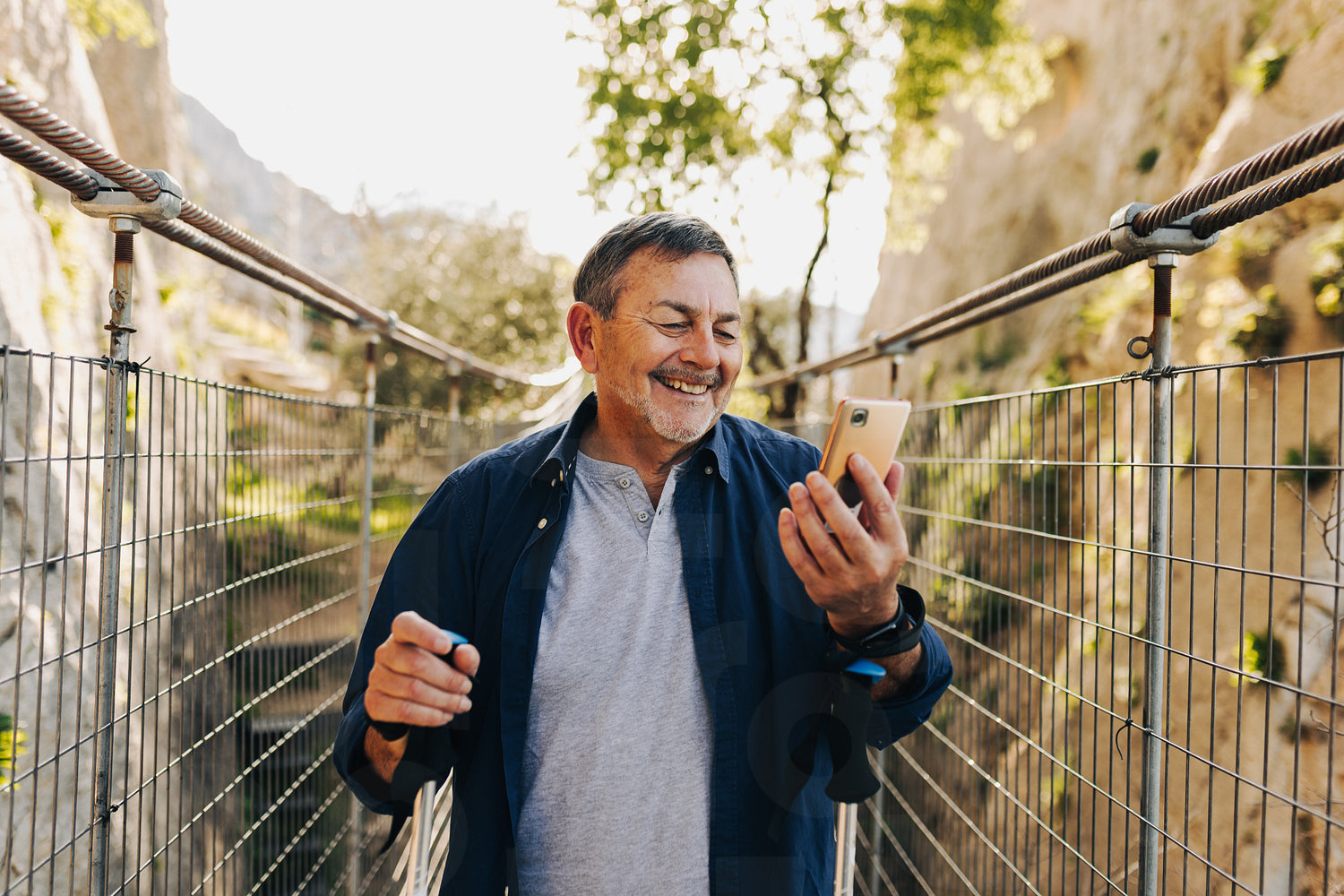 Happy senior man having a video call while crossing a bridge with trekking poles. Cheerful elderly man going on a leisurely hike. Mature man enjoying recreational activities after retirement.