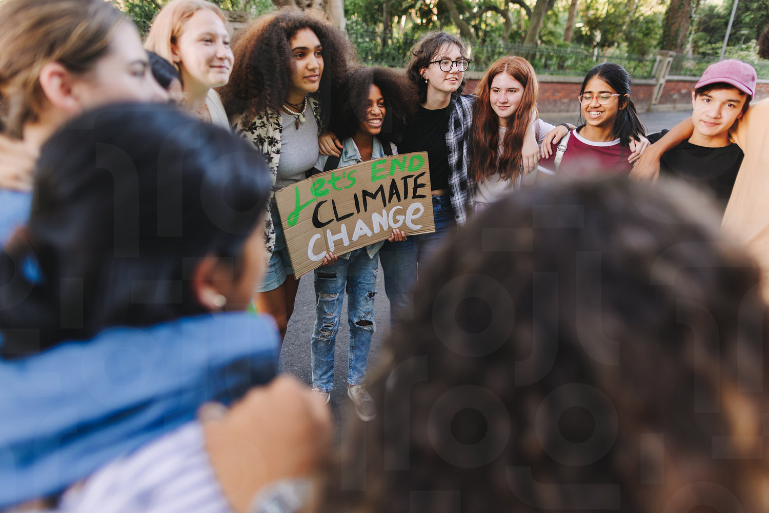 Group of multicultural young people standing together in a circle at a climate change demonstration. Happy youth activists joining the global climate strike.