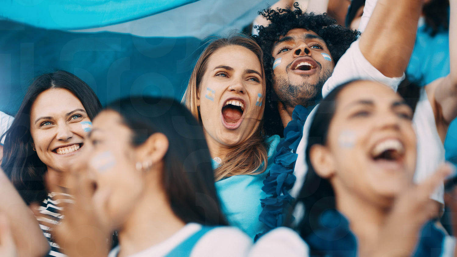 Excited sports fans at live game shouting and cheering for their team. People watching football match chanting to cheer argentinian national team.