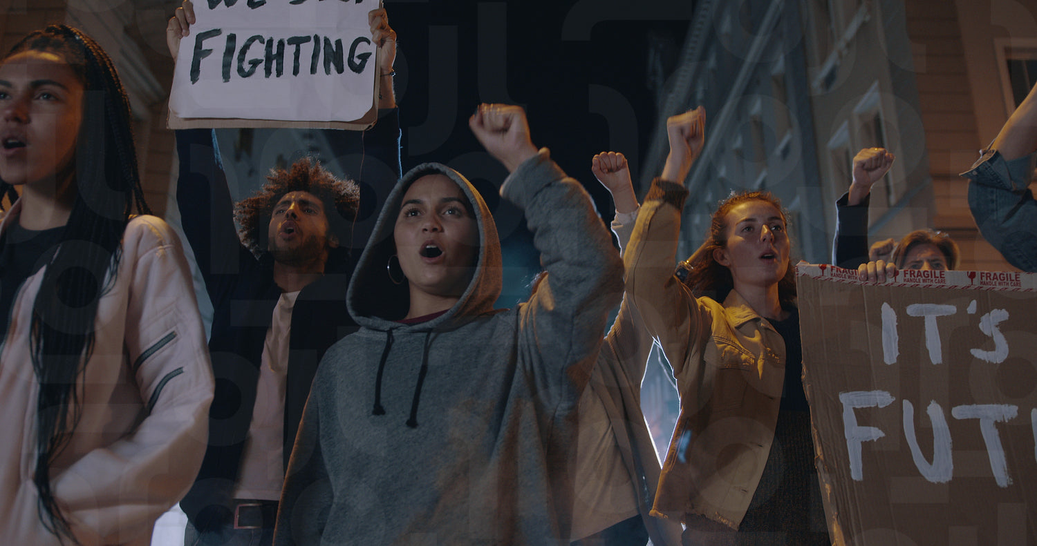 Group of demonstrators on road. Activists protesting together at night.
