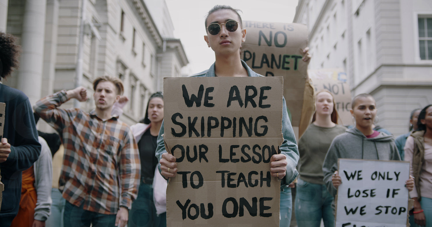 Young student holding poster with "we are skipping out lesson to teach you one". Group of demonstrators making protest about climate change.