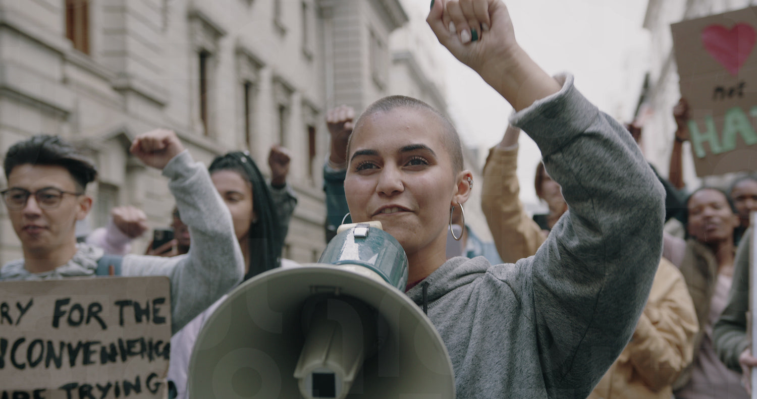 Group of people protesting on the street. Woman with a megaphone shouting slogans during a protest march.