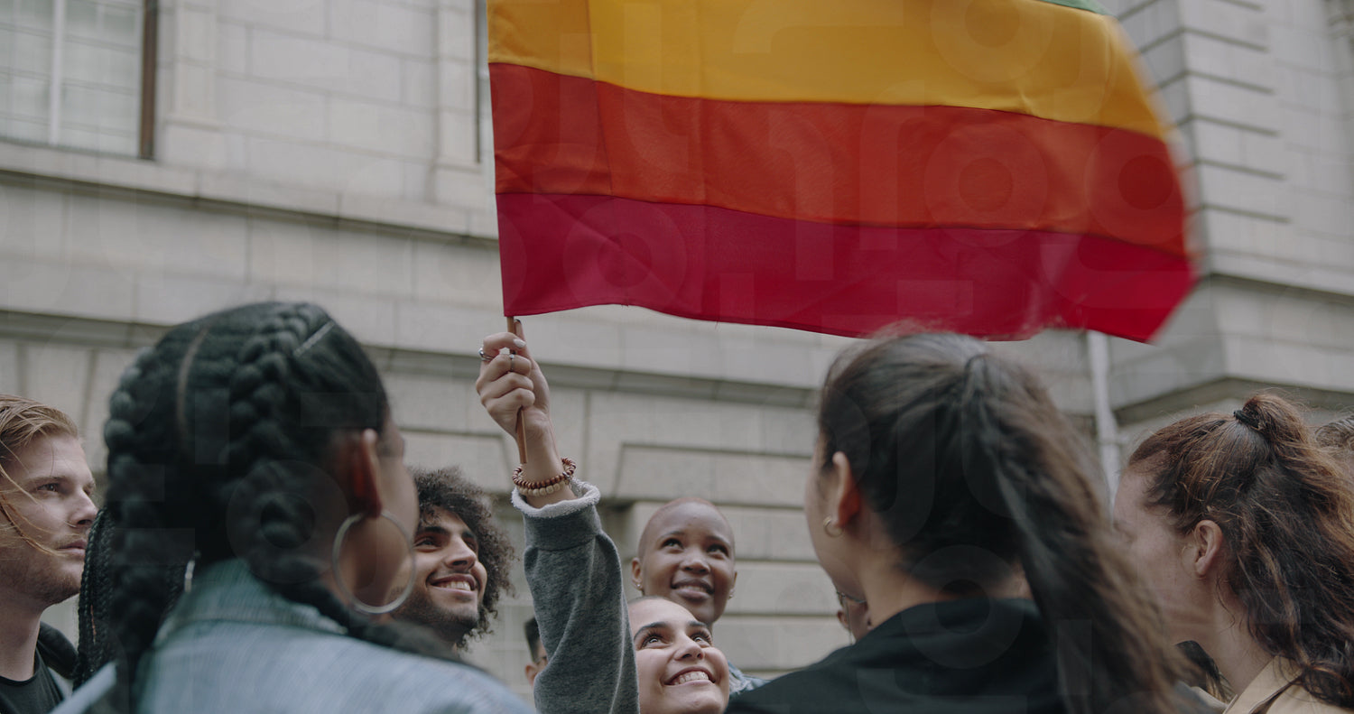 Group of people proudly looking at a rainbow colored flag at gay parade. Group of men and women in gay pride march.