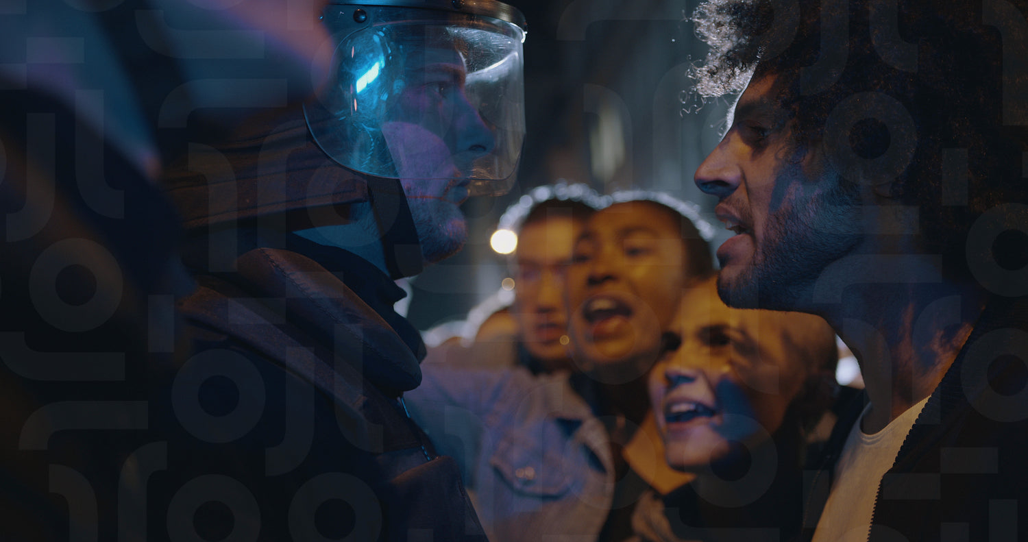 Protestors giving slogans in front of police. Group of men and women demonstrating against police violence.