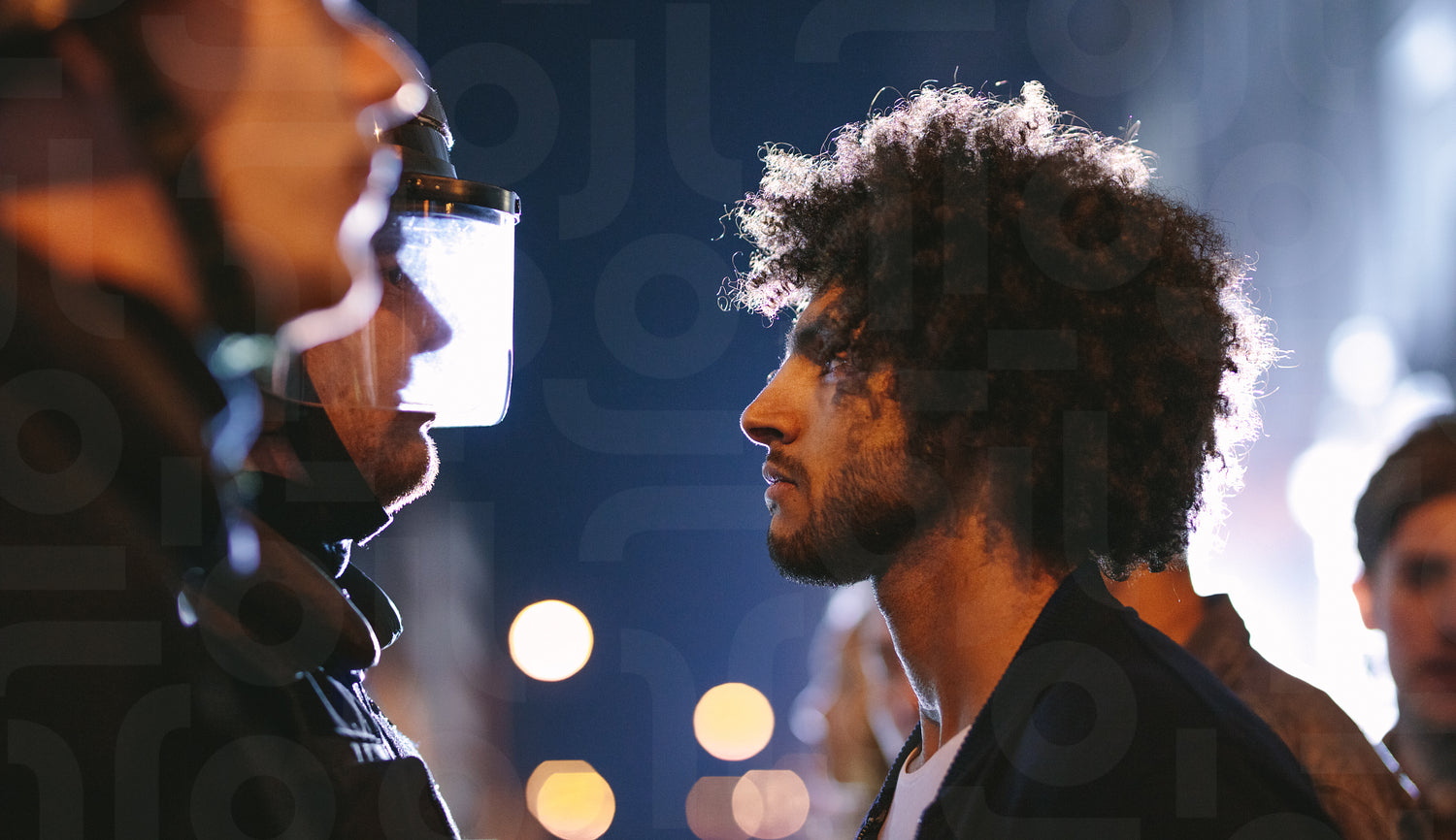 Protestors standing in front of police. Group of people demonstrating against police force.