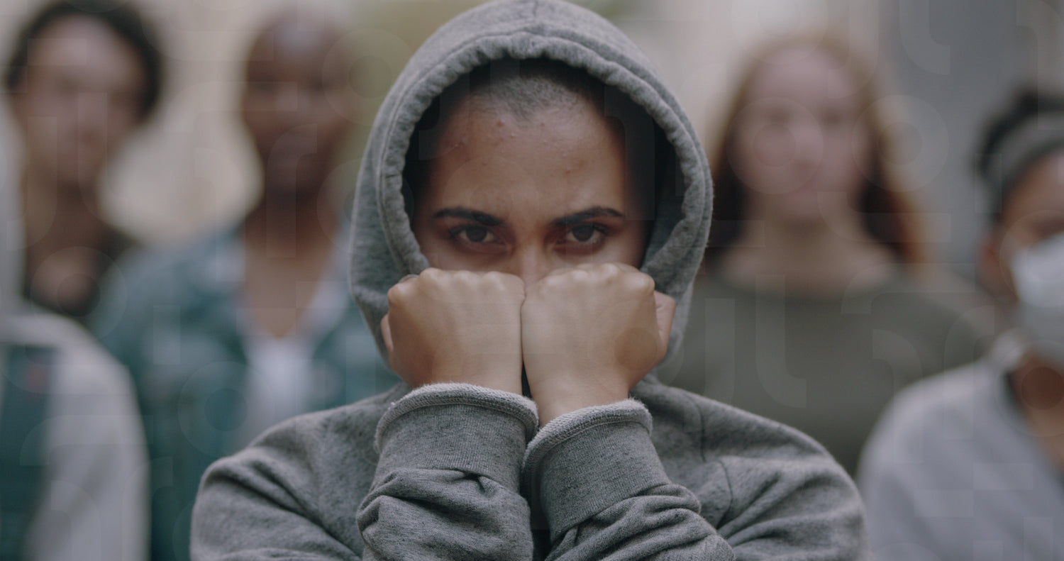 Woman activist in hooded shirt covering her face with her hands doing silent protest. Social activist protesting silently.