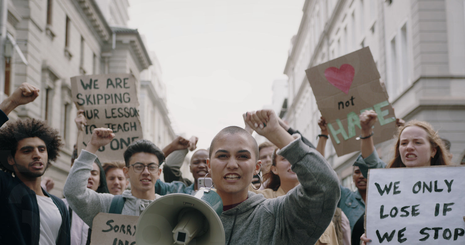 Group of demonstrators protesting during a march in the city. Social activists going on strike and demonstrating with slogans on the street.