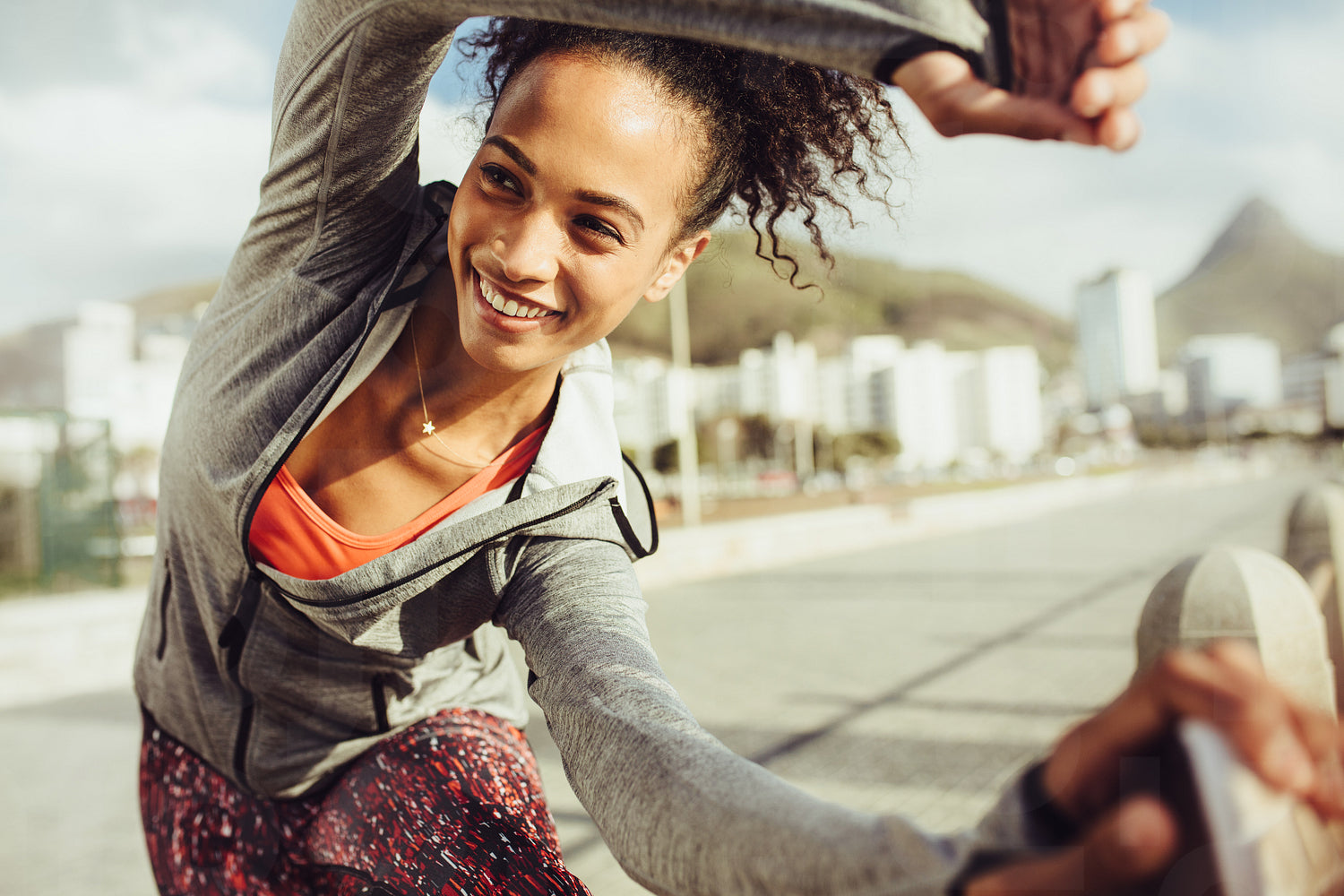 Fit athletic woman stretches outdoors. Woman in sportswear working out on a railing by the road.