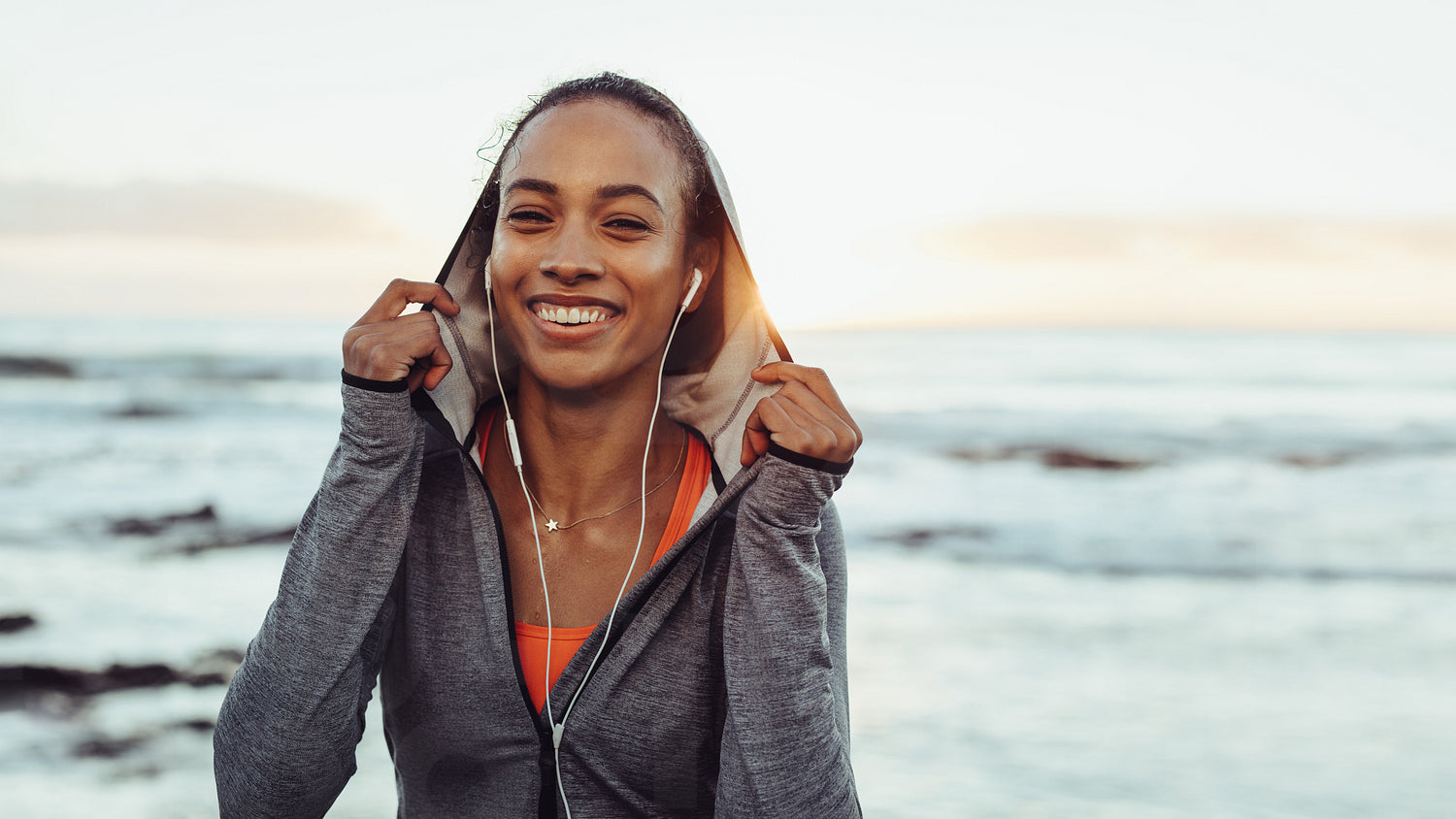 Positive young woman runner in sportswear and earphones outdoors against sea. Female resting after workout by the sea.