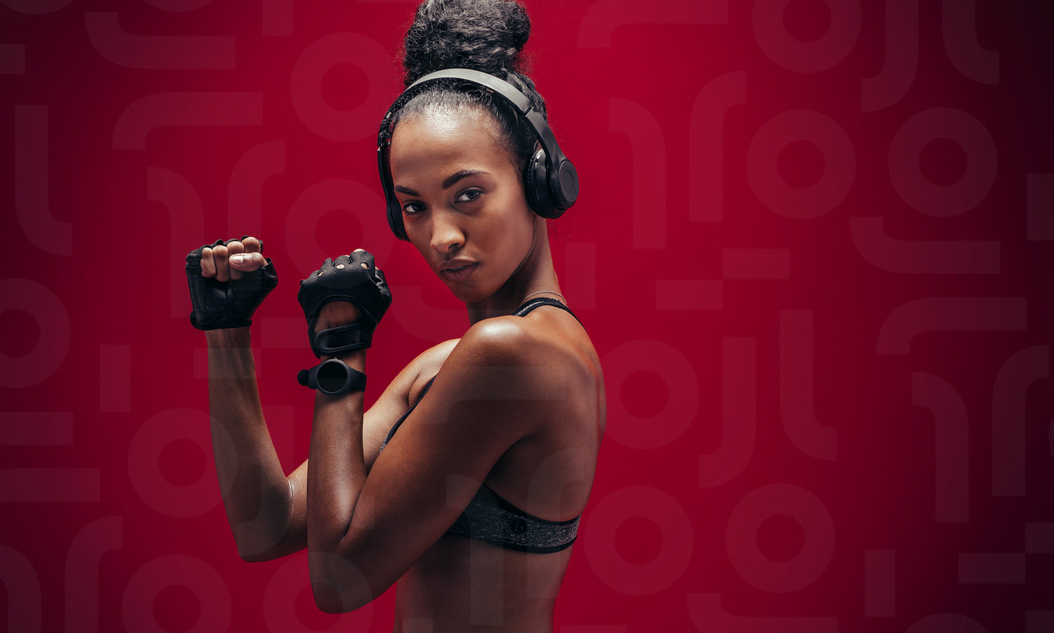 Confident young woman with headphones standing in a fighting stance. Beautiful and fit woman ready for her workout on red background.
