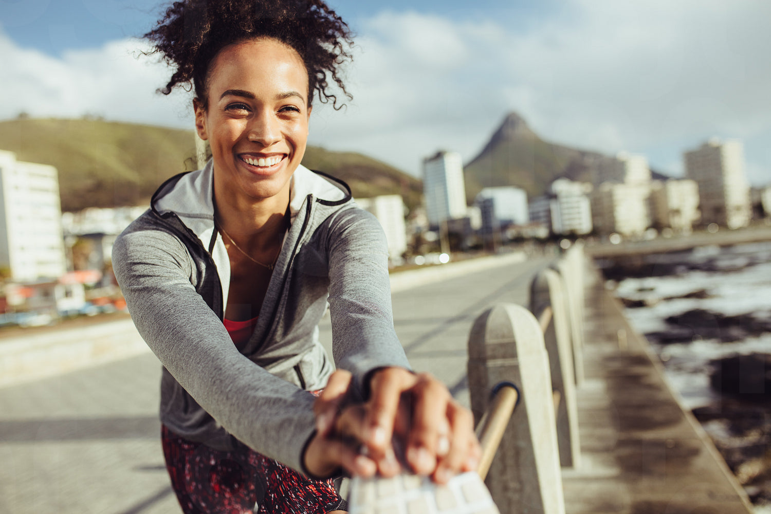 Woman runner exercising and smiling outdoors. Confident female runner in sportswear stretching on railing at seaside promenade.