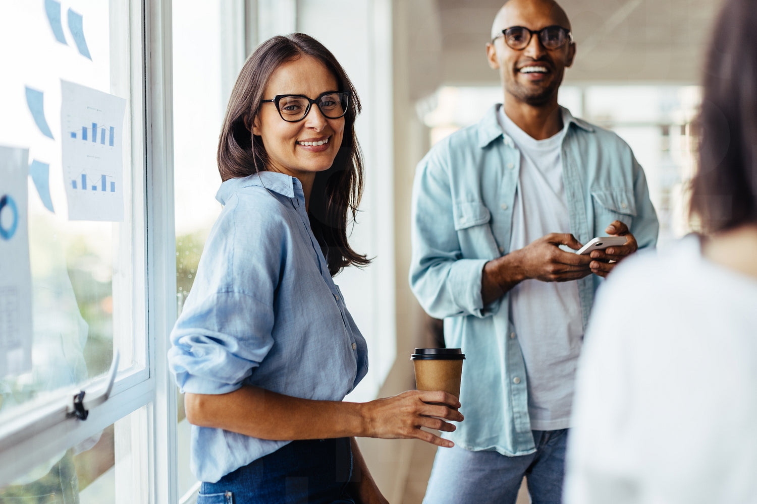 Business woman standing next to a window and having a meeting with her colleagues. Female sales executive working with her team in an office.