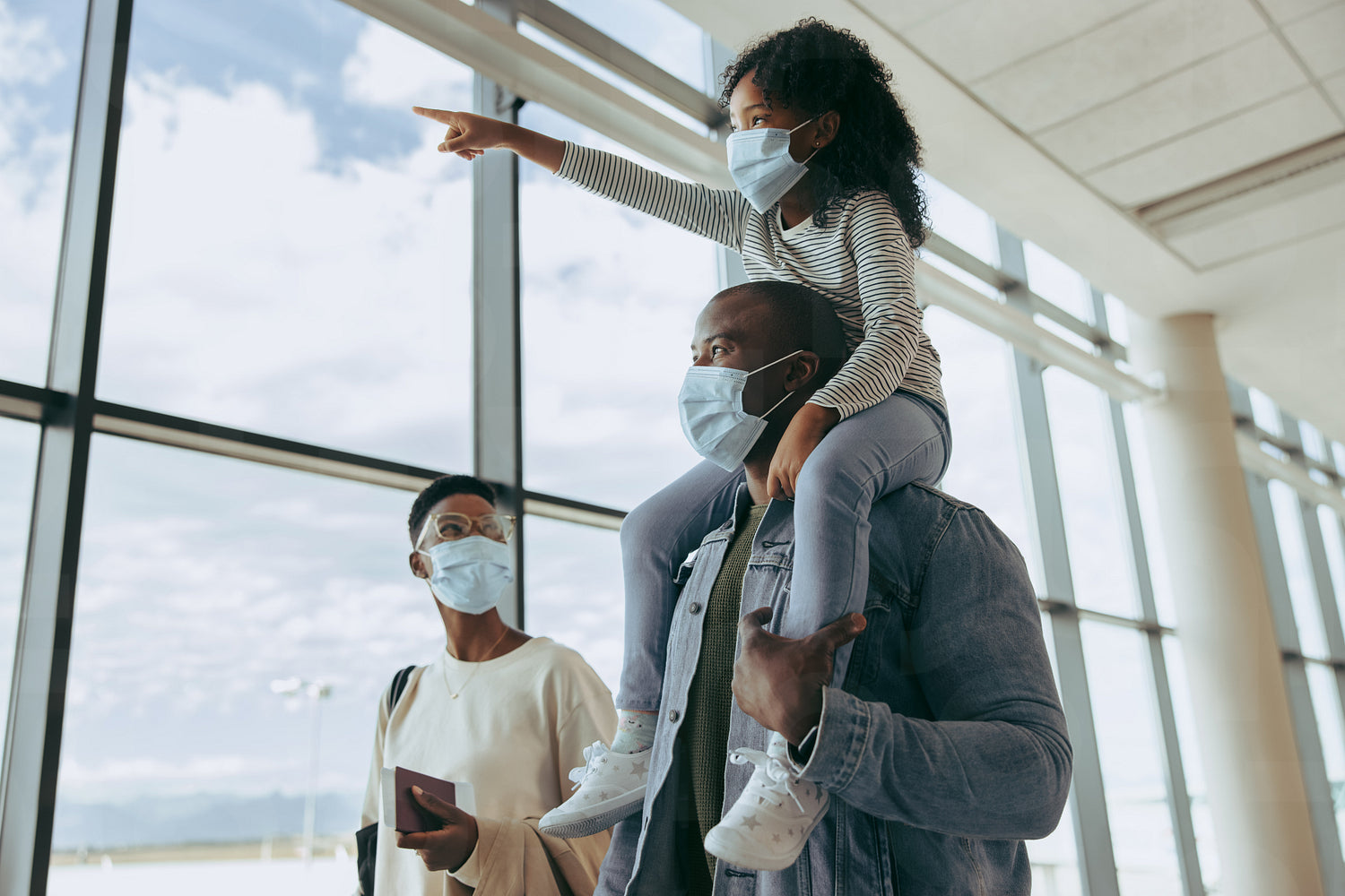 Father with daughter on shoulder and pointing airplanes while walking with mother at airport. African family at airport in pandemic.
