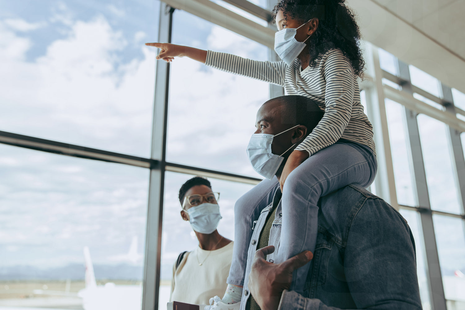 Family going for boarding their flight at airport during pandemic. Daughter on father's shoulder and pointing airplanes while going with mother at airport.