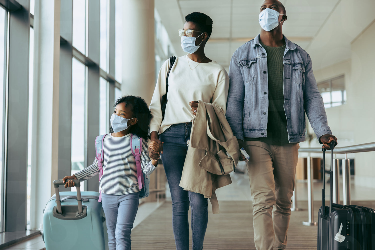 Family in face masks at airport terminal going for holiday looking away. Family of three walking with luggage through airport corridor.