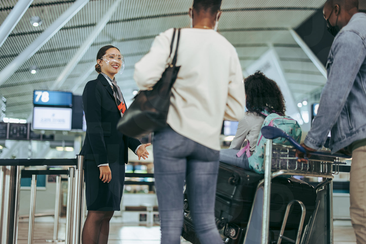 Airport staff during pandemic helping traveler family at boarding gate. Ground staff at airport assisting tourist in face masks during pandemic.