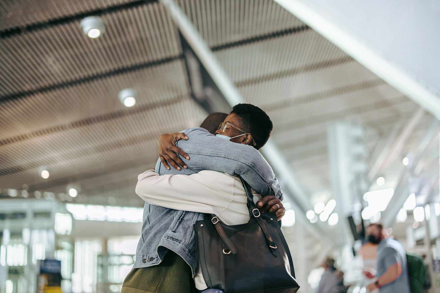 Couple embracing at airport during pandemic. Man hugging woman before bidding goodbye at airport terminal.