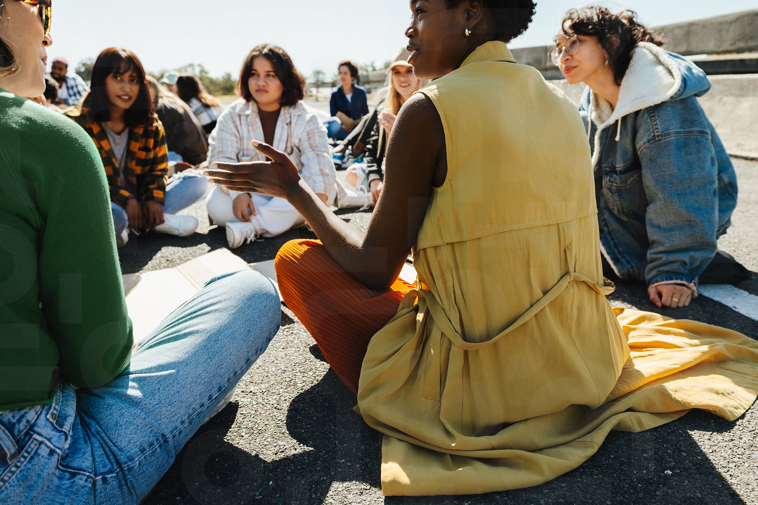 A diverse group of individuals sit outdoors, participating in a peaceful demonstration, and engaging in discussions around a common cause, fostering a sense of unity and community.