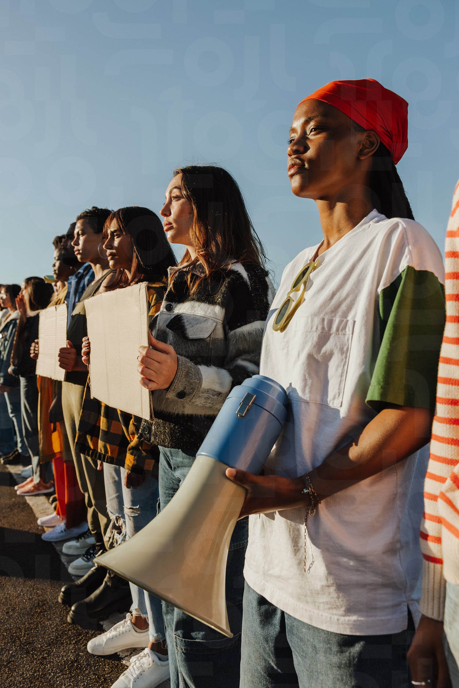 A line of diverse individuals standing in unity holding protest signs in support of a cause, showcasing determination and community.