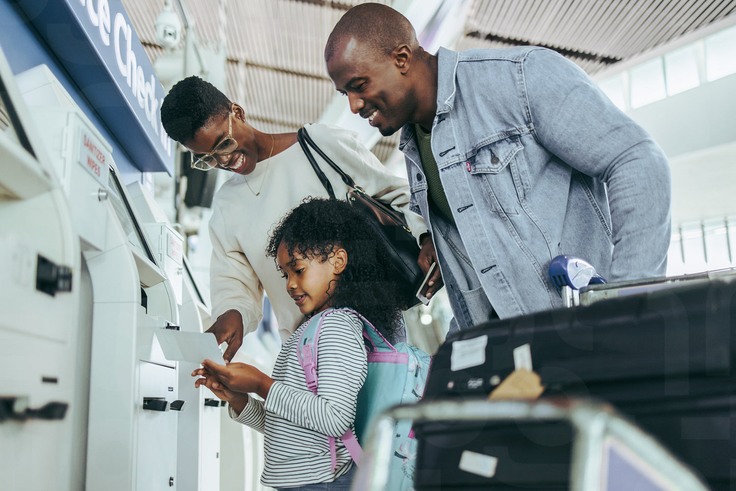Family at self check-in machine at international airport. Small girl with family looking at boarding pass at airport terminal.