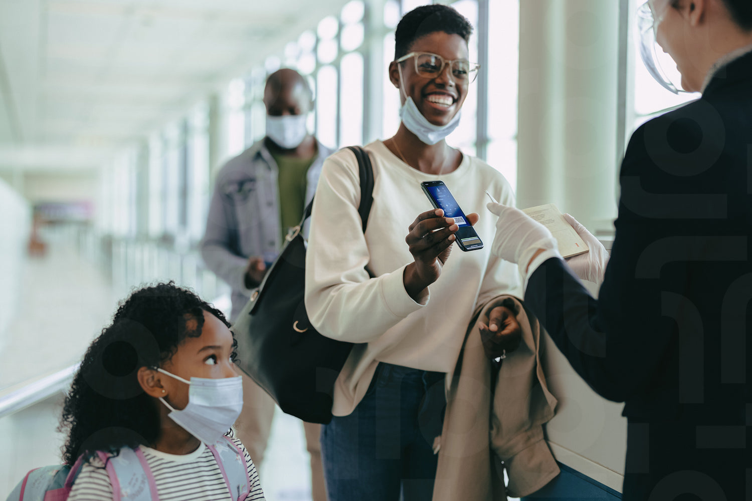 Traveling family showing digital boarding pass to attendant