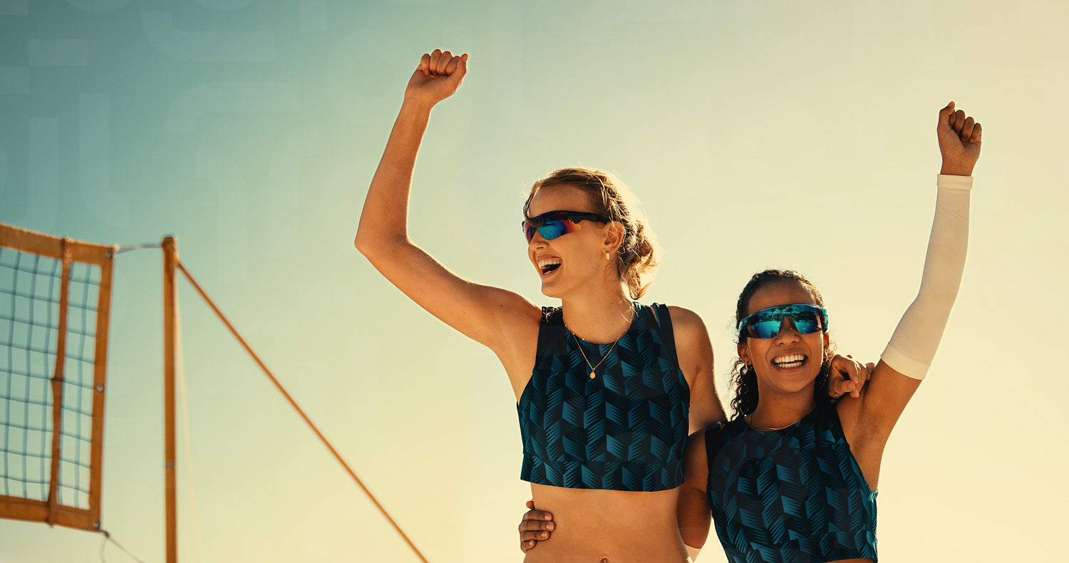 American athletes celebrate their victory on a coastal beach during a championship match. Female players, wearing sunglasses, raise arms in triumph against a stunning sunset. A true display of teamwork and sportsmanship.