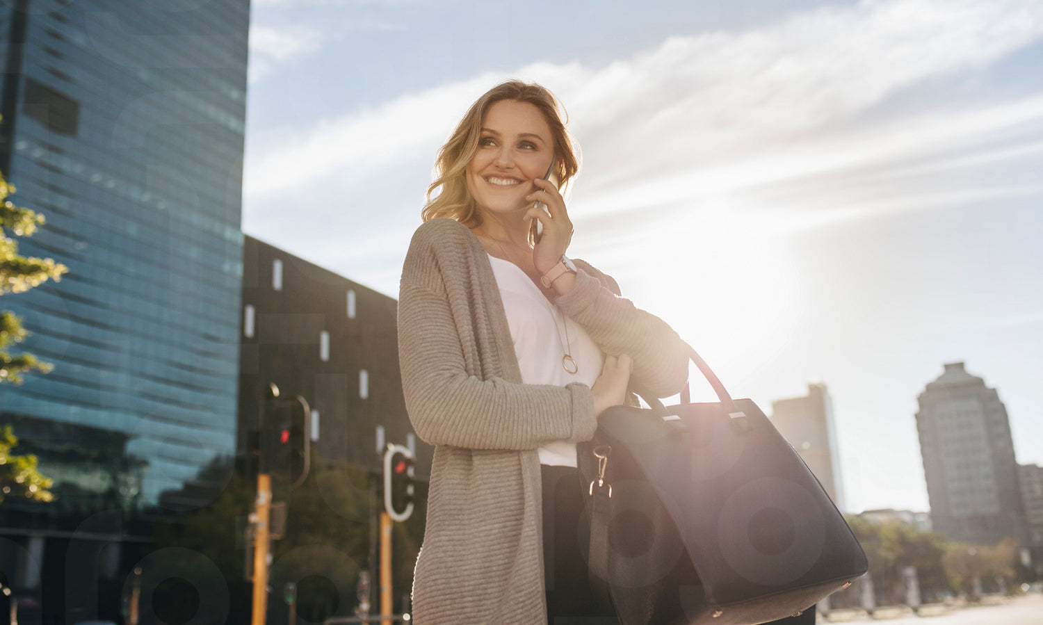 Businesswoman walking outside talking on cell phone. Female business professional making a call while walking on the street