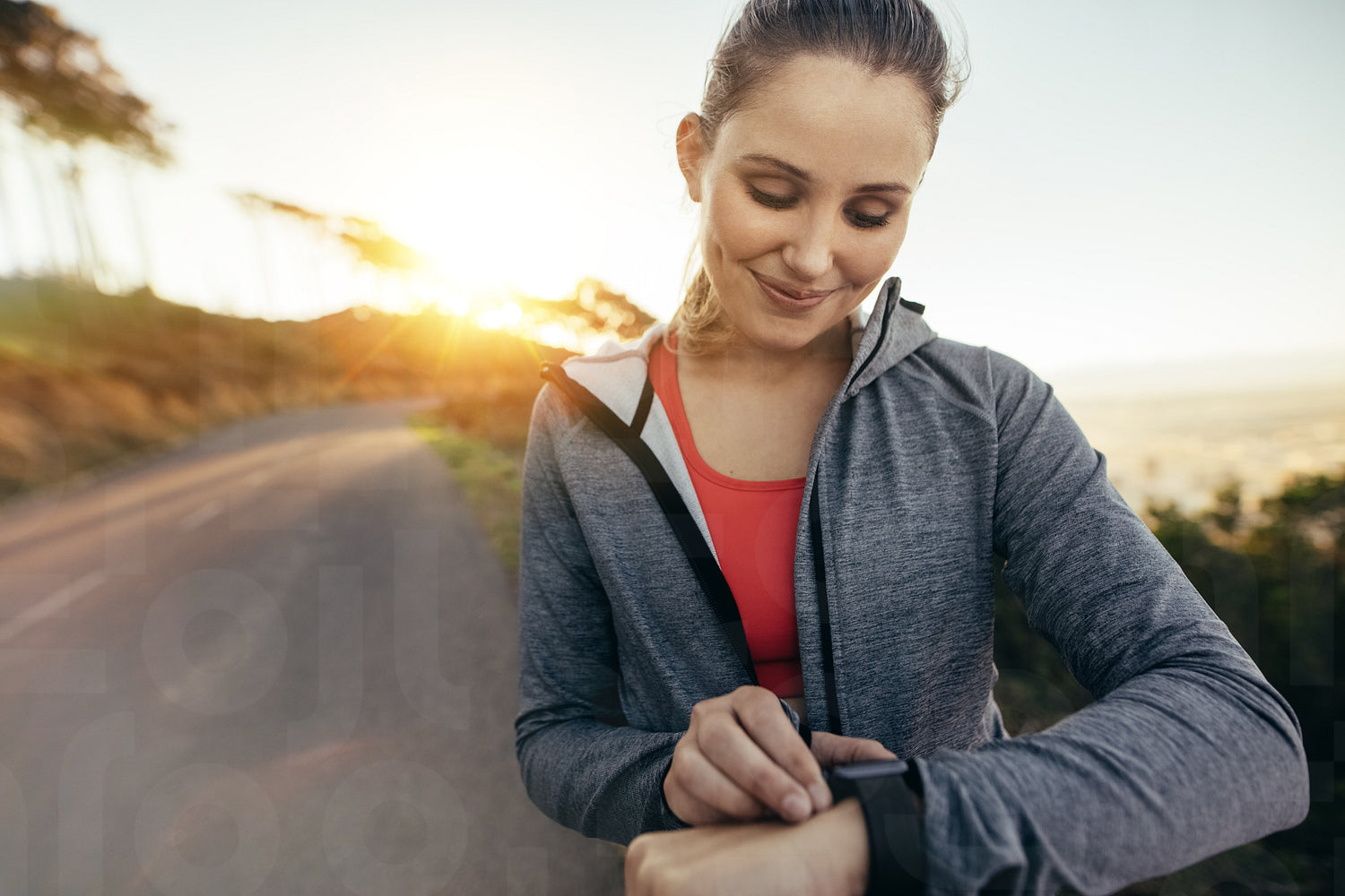 Smiling fitness woman checking time during her morning walk with sun in the background. Portrait of a female runner adjusting her wrist watch while jogging in the morning.