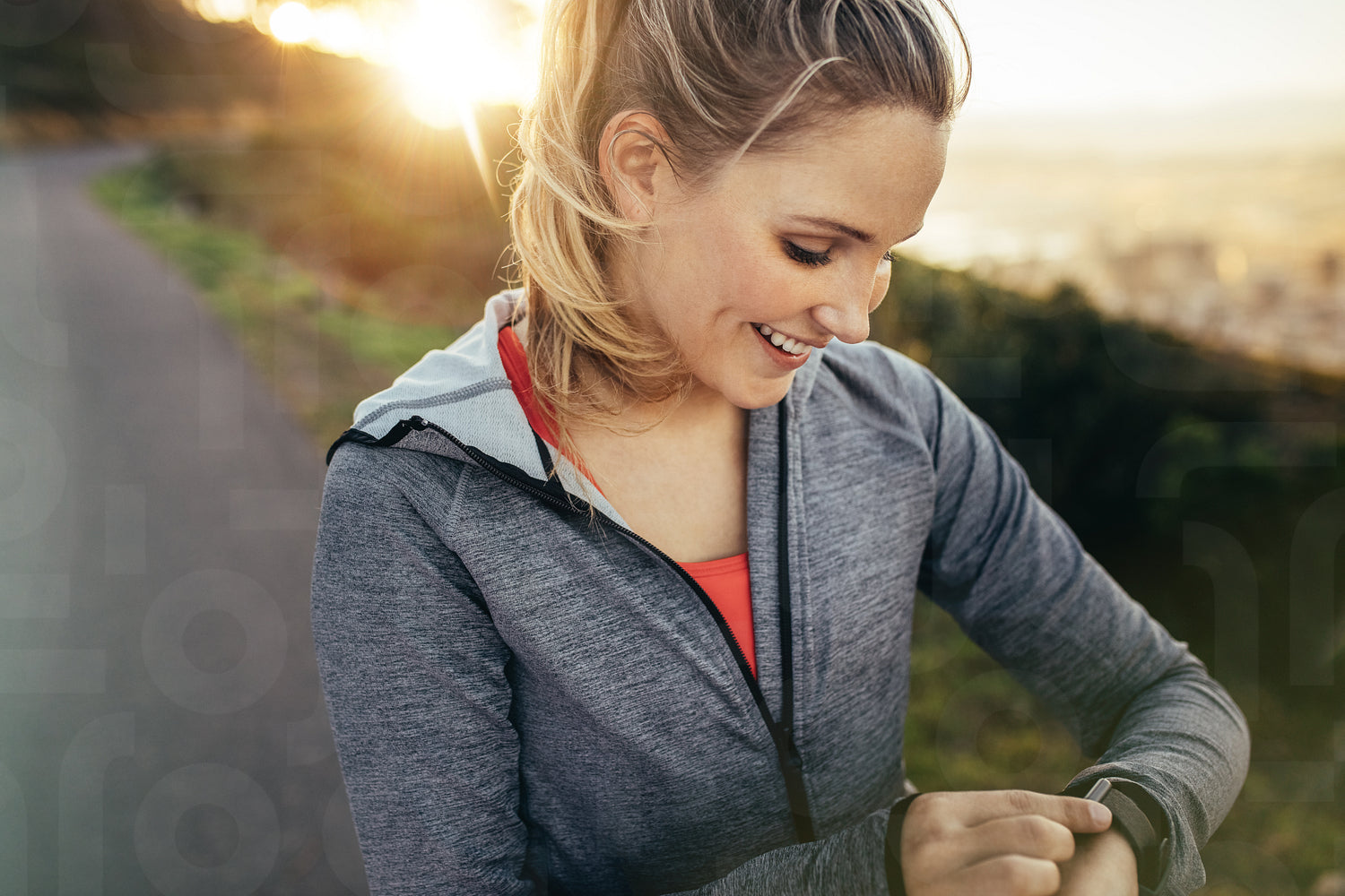 Smiling fitness woman setting a timer in her wrist watch standing outdoors. Female runner checking time in her watch during her morning run.
