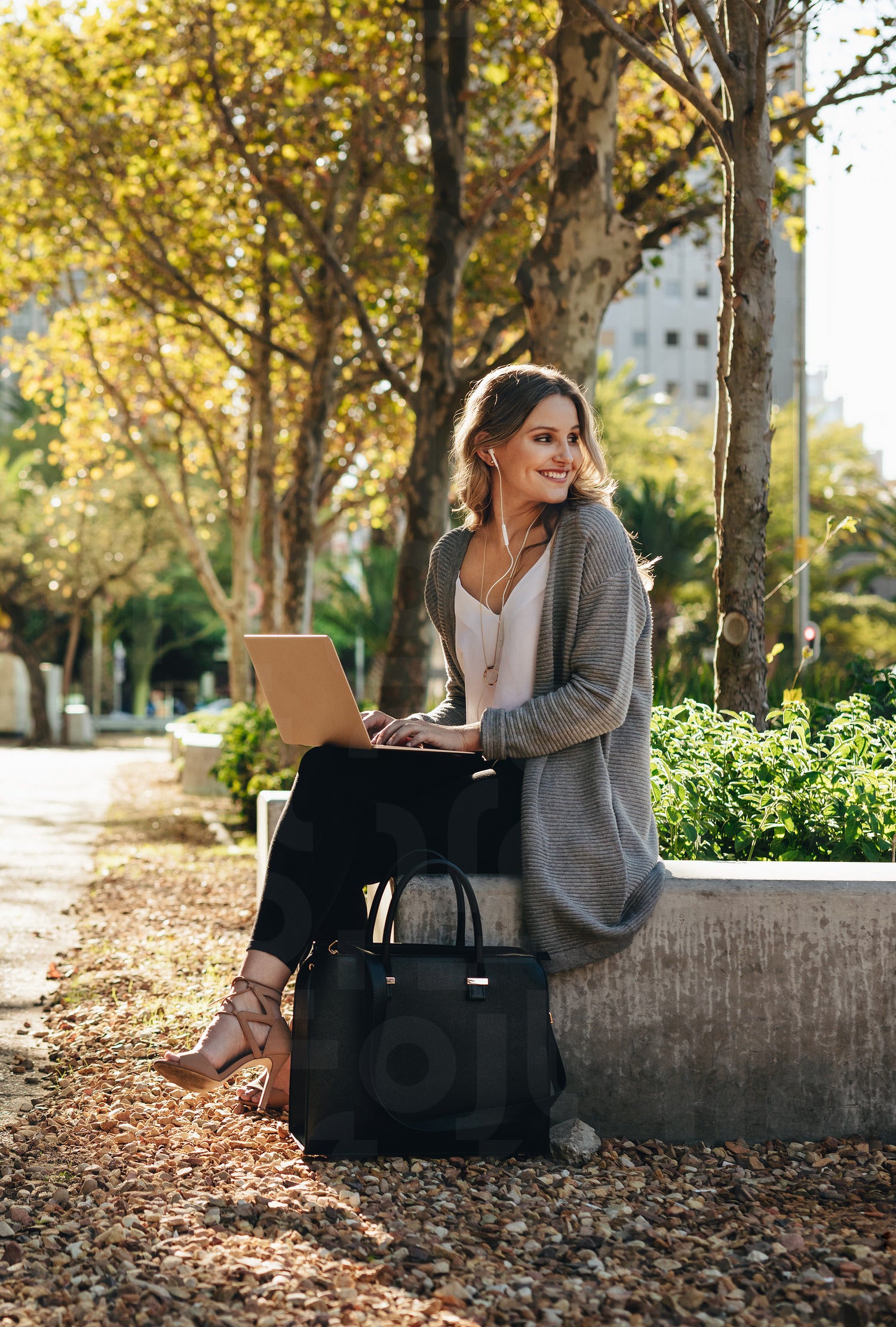 Smiling young woman sitting outdoors with laptop. Woman looking away and smiling while sitting outside in the city.