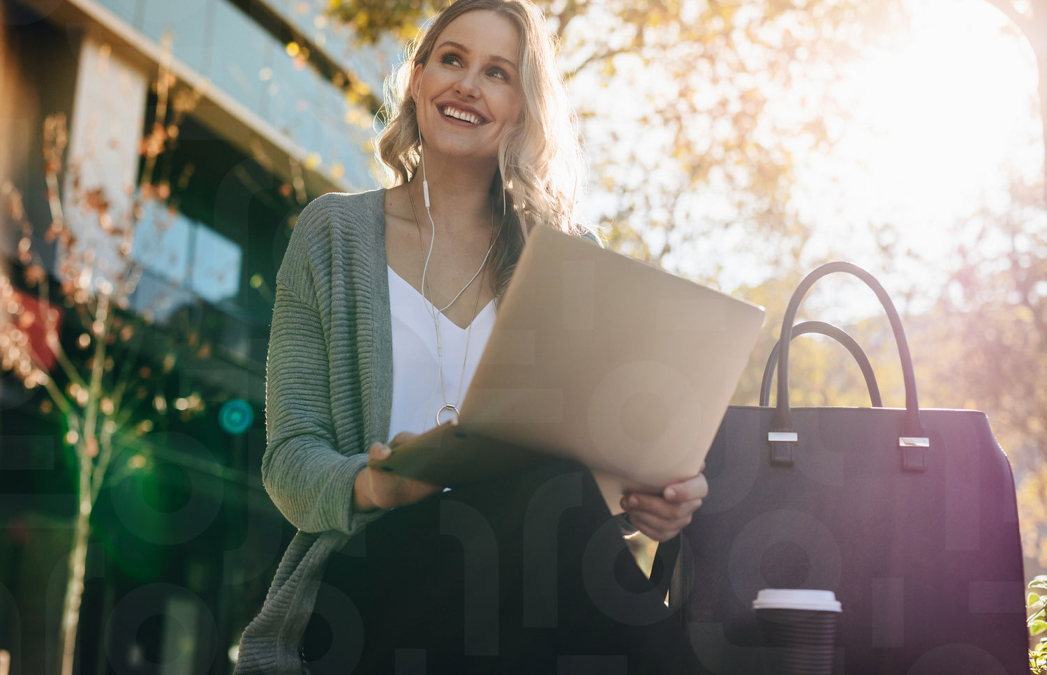 Woman wearing earphones sitting outside using laptop. Businesswoman sitting outdoors in the city with laptop on a sunny day.