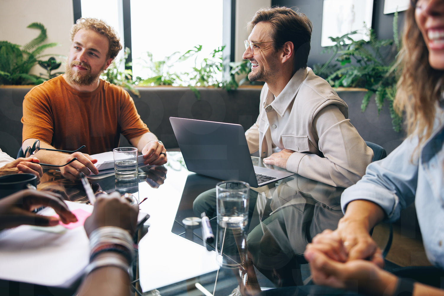 Group of business professionals, male and female, meeting in a boardroom to discuss strategies and plans for future growth. Professional team collaborating on a project in a modern office.