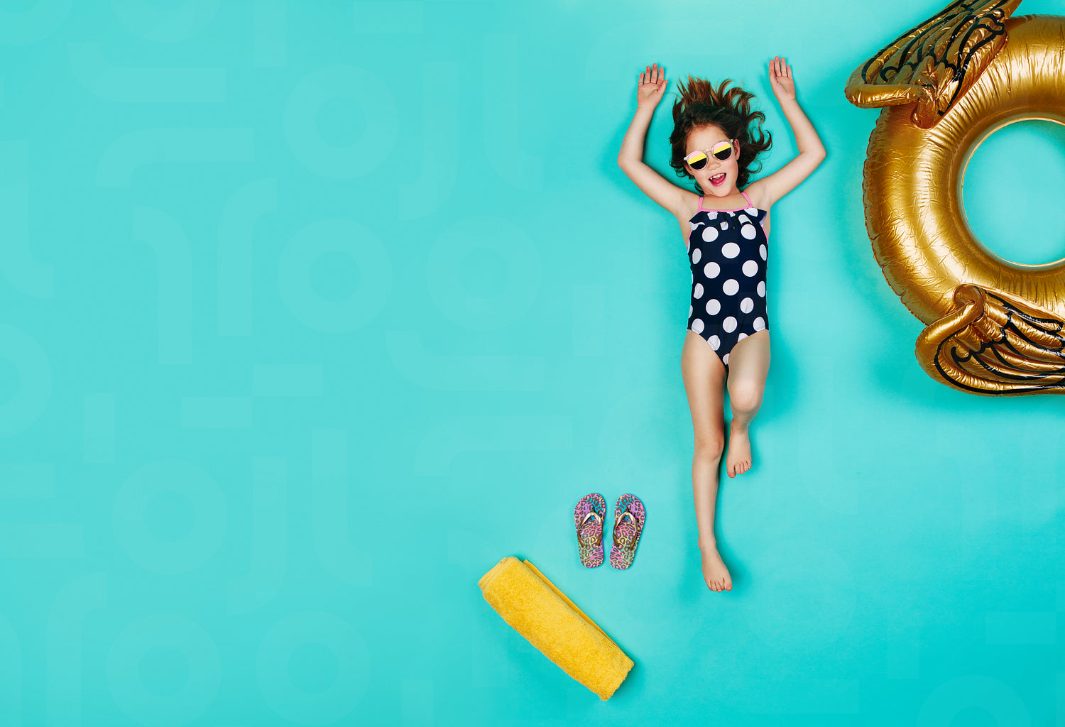 Happy girl in swimsuit and sunglasses lying on blue background. Girl lying down on floor with inflatable ring, slippers and towel looking at camera smiling with her hands raised.