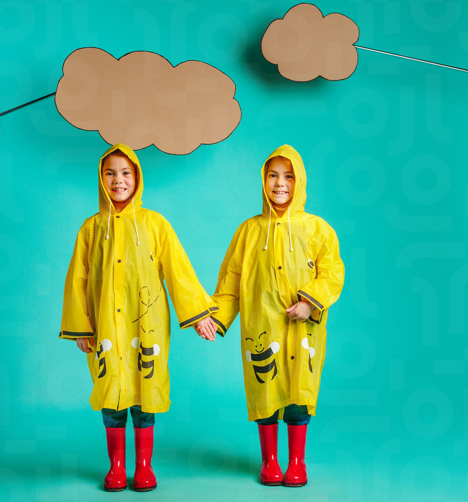 Happy twins girls wearing raincoat standing together holding hands under paper clouds. Small girls in rainwear standing on blue background.