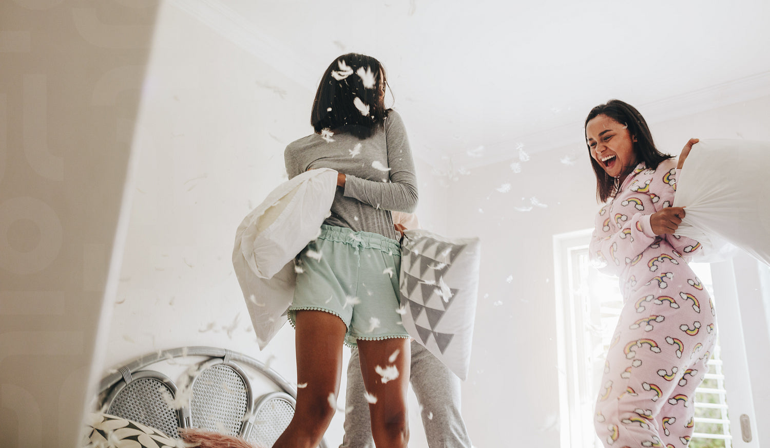 Young girls pillow fighting standing on bed. Girls having fun playing with pillows at a sleepover with feathers flying around.