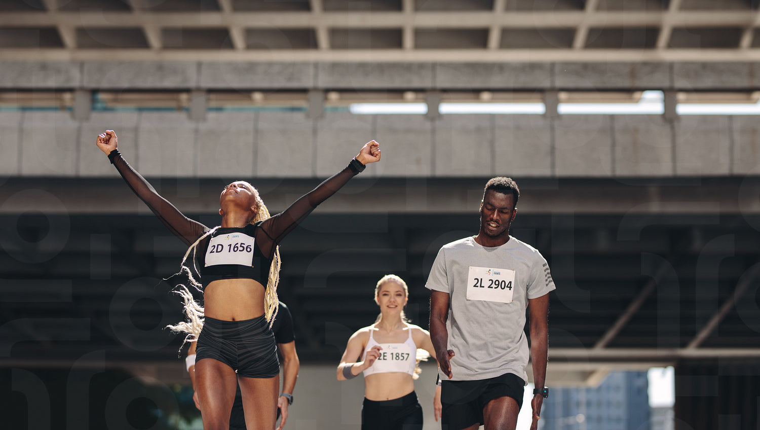 Sportswoman celebrating her victory in the marathon race. Female runner running with her hands raised after winning the race.