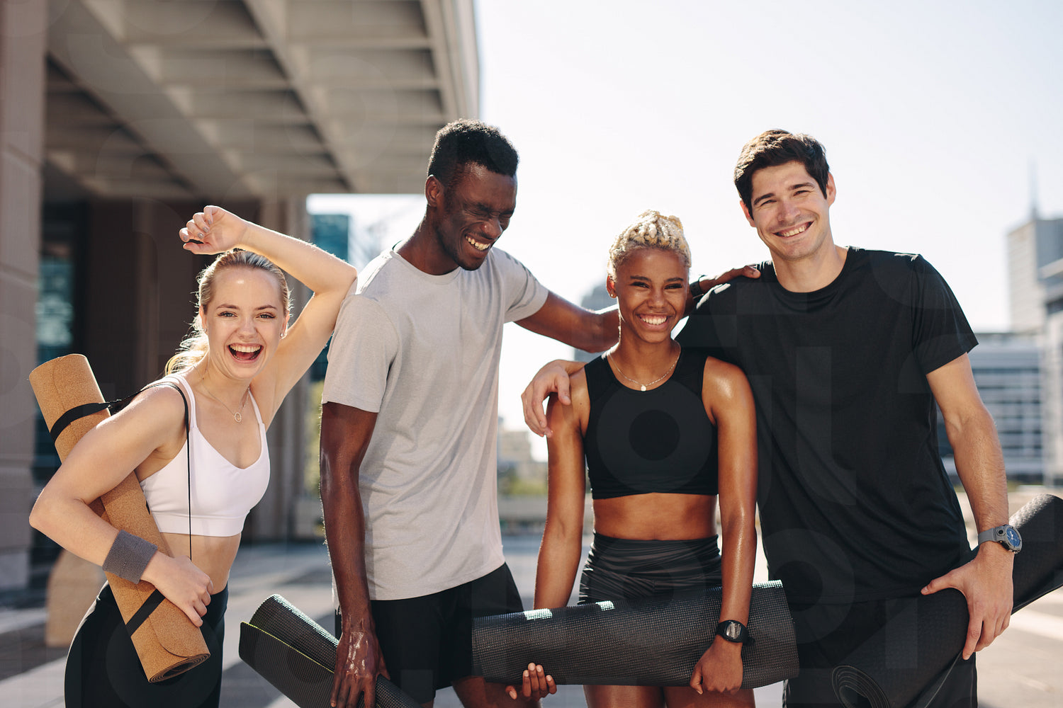 Multi-ethnic friends with fitness mats standing outdoors after workout. Fitness group smiling after workout.