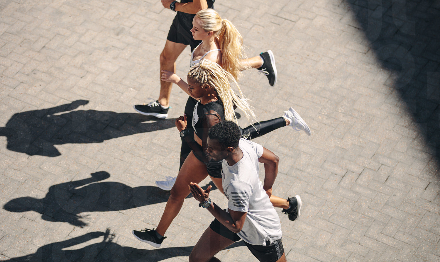 Top view of group of runners running in the city. Men and women running together outdoors.