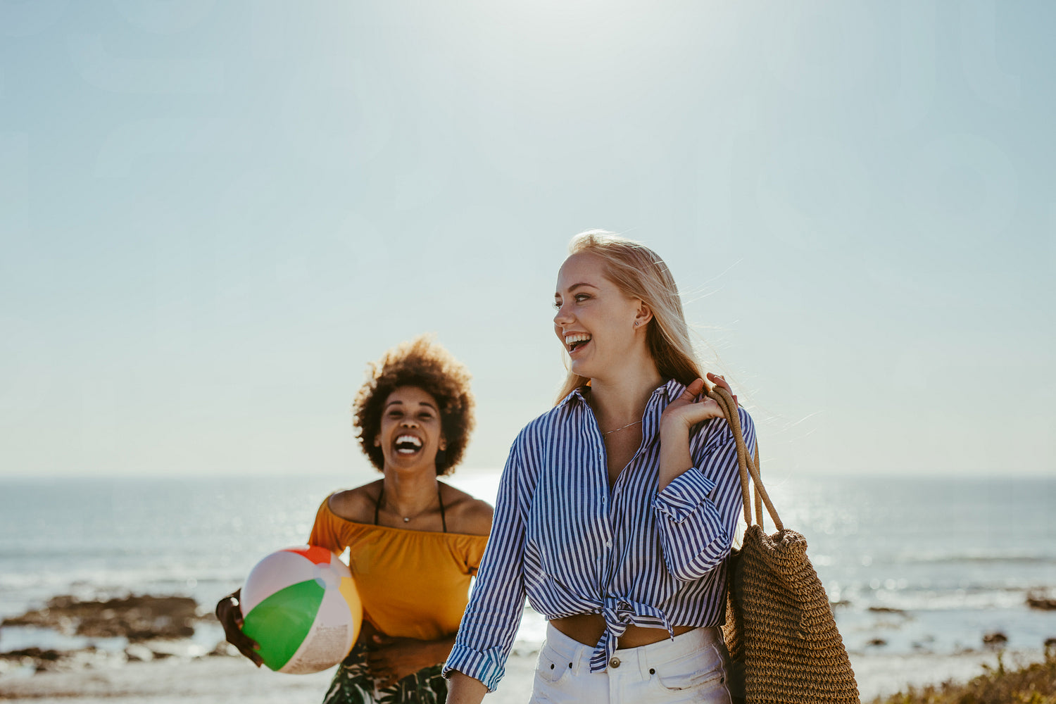 Cheerful young women walking with a ball and bag along the sea shore. Female friends on beach vacation.